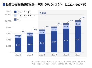 2023年の調査結果によると、動画広告市場は高水準で増加しており、その傾向は2027年まで同程度の水準で拡大し続けると推測されています。