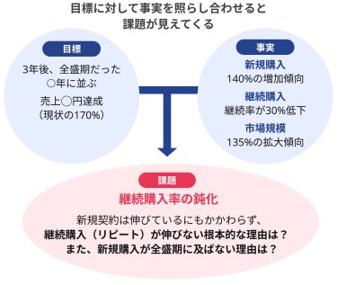 最初のステップは、いま向き合わなければいけない一番の課題・イシューを明確にすることです。達成すべき目標や予算に対して、何がボトルネックになっているかを導くためには、まず社内外の現象・事実の参考となるデータを集めましょう。